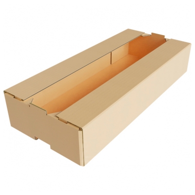 Самосборный лоток представлен в оригинальной конфигурации со сложной системой сгибов. Главным отличием от стандартных моделей является наличие частично закрывающегося верха. Перекрытие обеспечивается двумя узкими краями со стороны продольных стенок. Основой выступает картонная заготовка, которая нарезается по проектному шаблону. Лист загибается в разных направлениях. В нижней части торцевых гранях предусмотрены вырезы-ручки для удобства переноса ящика в пределах рабочей зоны.